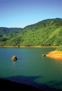 Tiếp tục cuộc hành trình đi ngược lên phía đầu nguồn. Nắng đã lên cao. Quang cảnh núi rừng cứ rộng mở dần, có cảm giác như dạo nào viếng thăm Phong Nha động ở Quảng Bình hay Tam Cốc ở Ninh Bình. Mười lăm phút lênh đênh trên sông nước đã nghe tiếng nước chảy róc rách. Nước từ trên cao, chảy theo những con khe, con suối đổ vào lòng hồ. Một bãi đá cũng là bãi tắm hiện ra. Chúng tôi bắt gặp nhiều nhóm người đã có mặt nơi đây để thư giãn trong ngày hè cuối tuần.